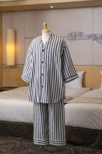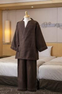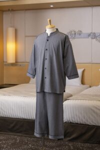 襟なしのボタン式の上下セット。 幅広い宿泊施設にマッチしやすいキャメル色のストライプ柄。 肉厚で柔らかな風合いのヘリンボーン生地を使用しています。 シワになりにくく丈夫で長持ちする生地です。 バイアスやボタンなどの色の変…