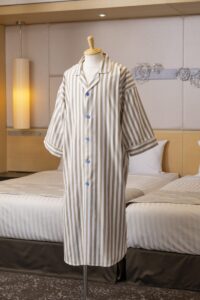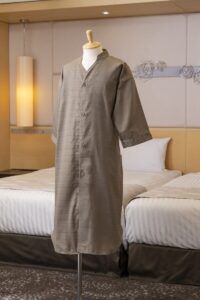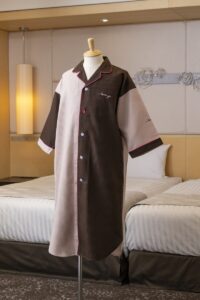 幅広い宿泊施設にマッチしやすいキャメル色のストライプ柄。 肉厚で柔らかな風合いのヘリンボーン生地を使用しています。 シワになりにくく丈夫で長持ちする生地です。 ガウン型のワンピース。バイアスやボタンなどの色の変更も可能で…