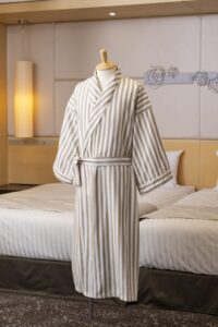 幅広い宿泊施設にマッチしやすいキャメル色のストライプ柄。 肉厚で柔らかな風合いのヘリンボーン生地を使用しています。 シワになりにくく丈夫で長持ちする生地です。 腰帯が縫い付けられたガウンタイプです。バイアスなどの色の変更…