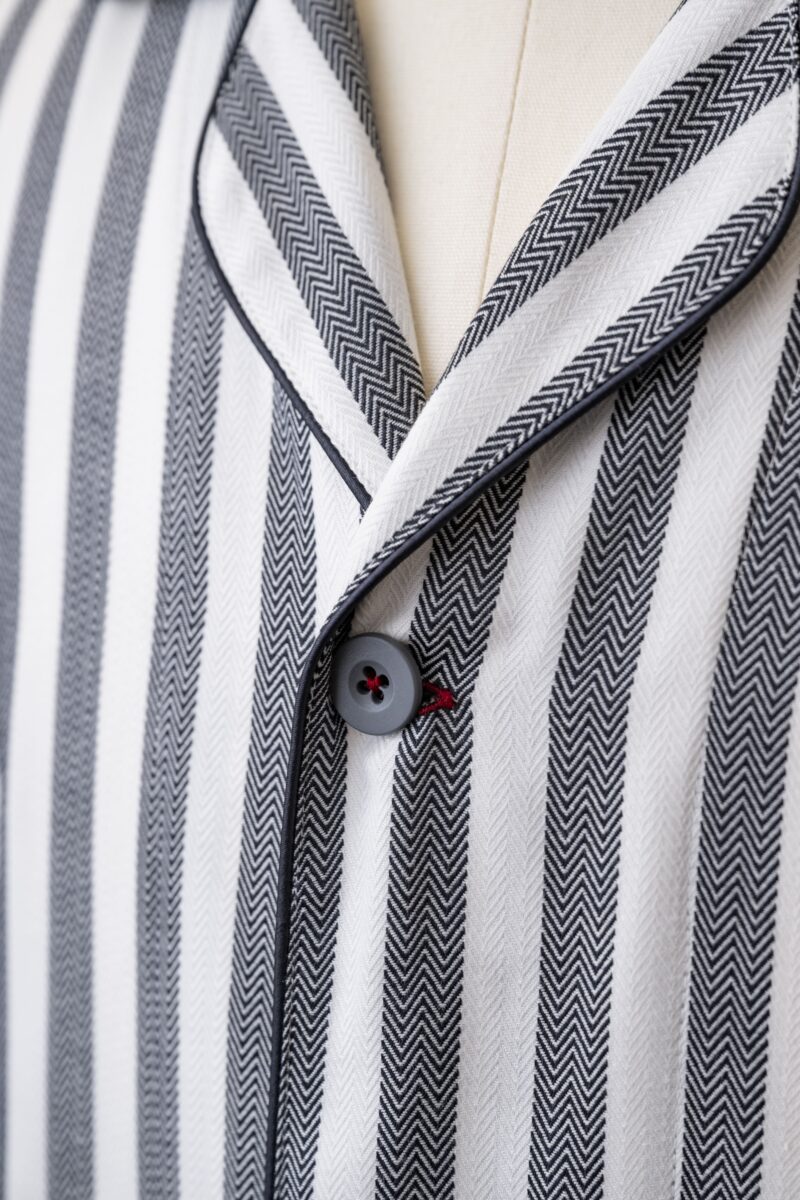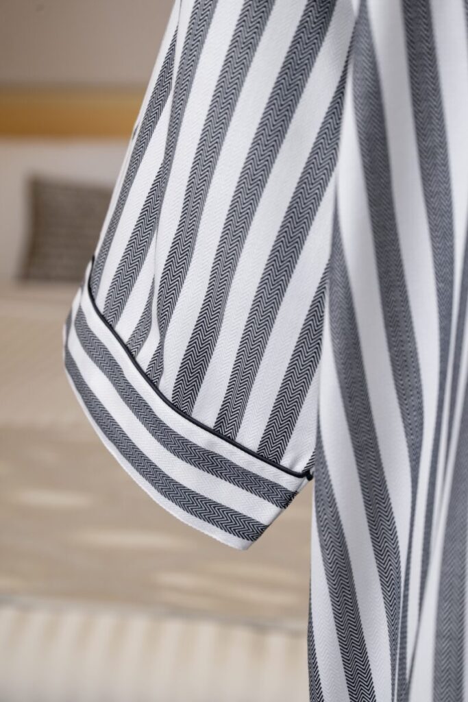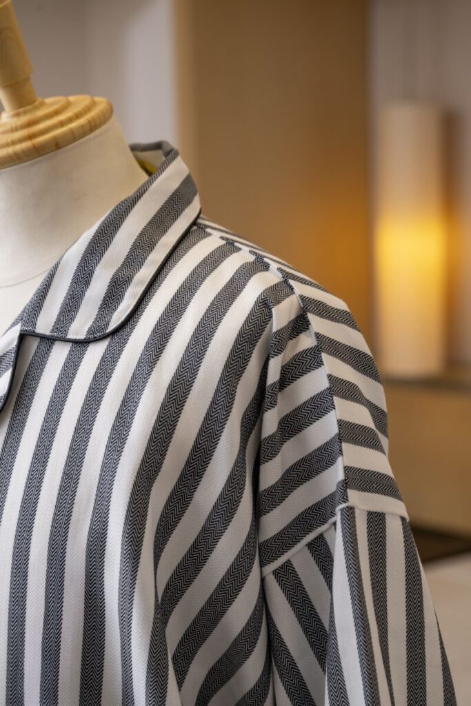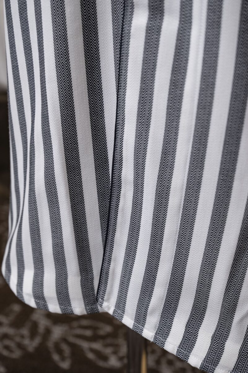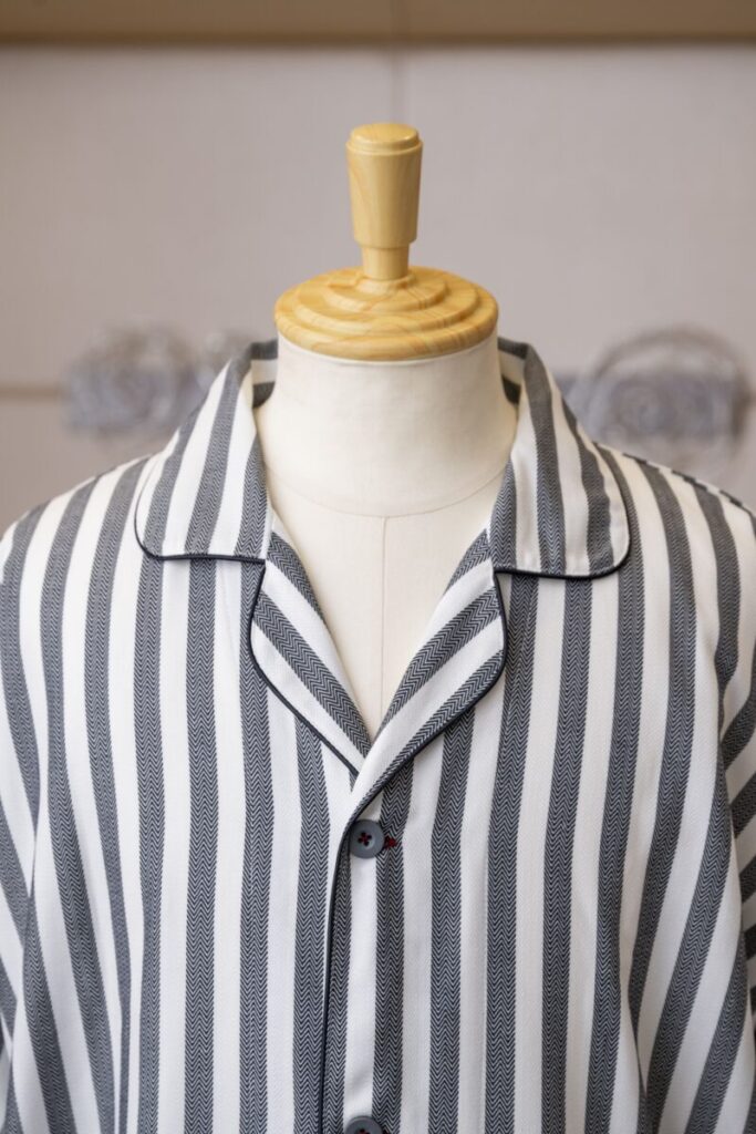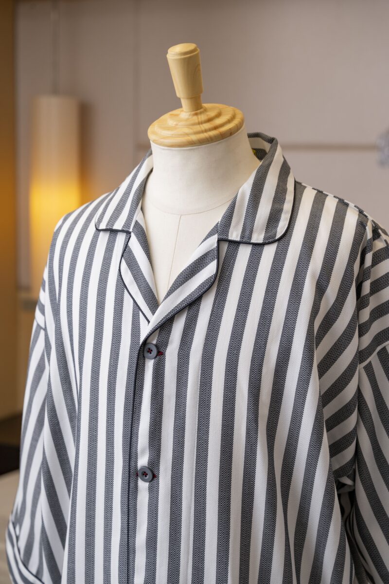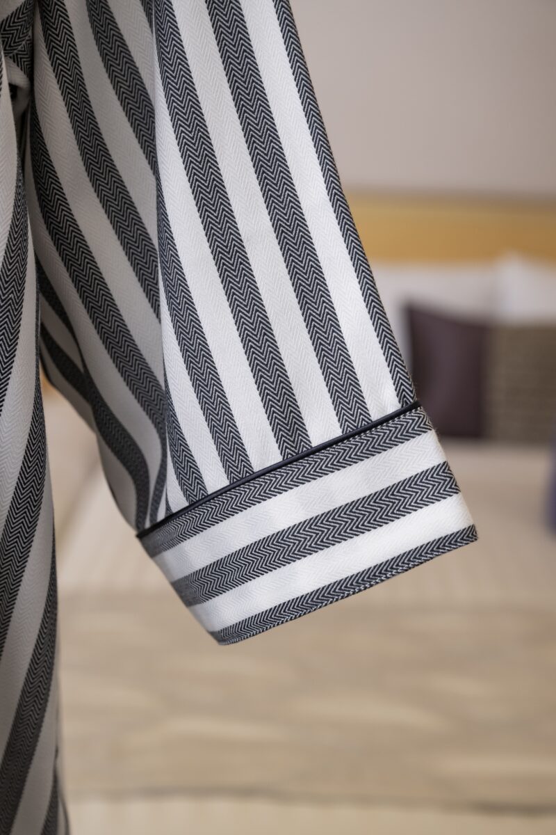 チャコール色の洗練された可愛らしさを表現したストライプ柄。 肉厚で柔らかな風合いのヘリンボーン生地を使用しています。 シワになりにくく丈夫で長持ちする生地です。 腰帯が縫い付けられたガウンタイプです。バイアスなどの色の変…
