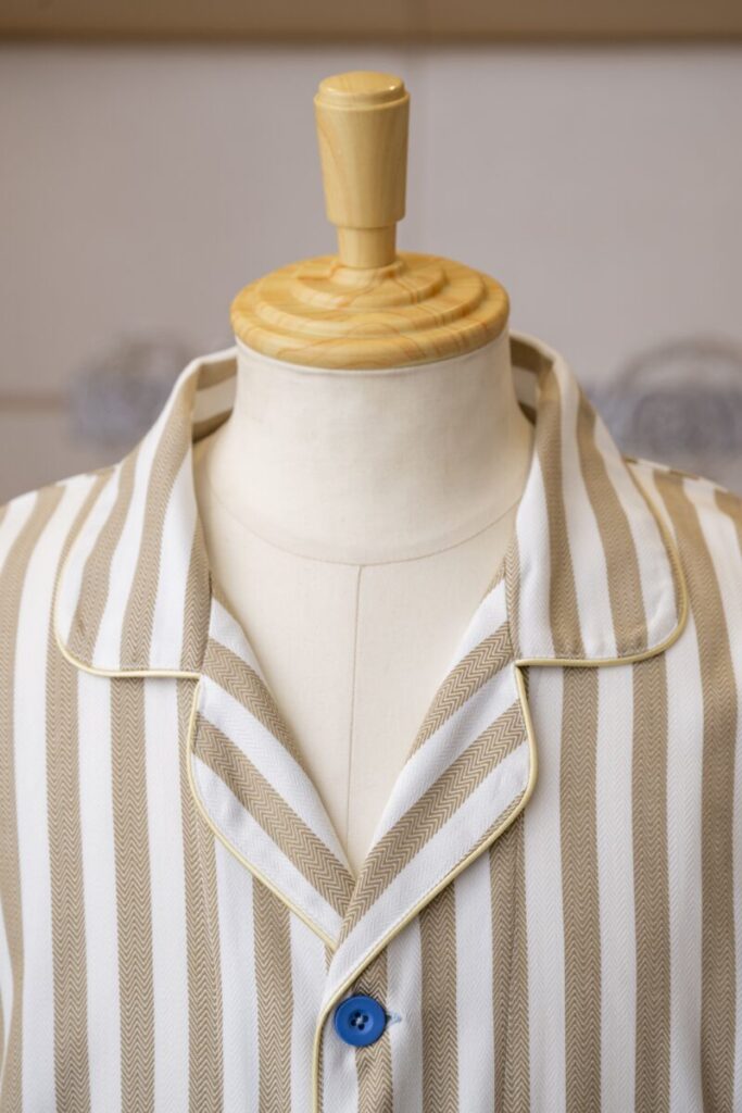 チャコール色の洗練された可愛らしさを表現したストライプ柄。 肉厚で柔らかな風合いのヘリンボーン生地を使用しています。 シワになりにくく丈夫で長持ちする生地です。 腰帯が縫い付けられたガウンタイプです。バイアスなどの色の変…