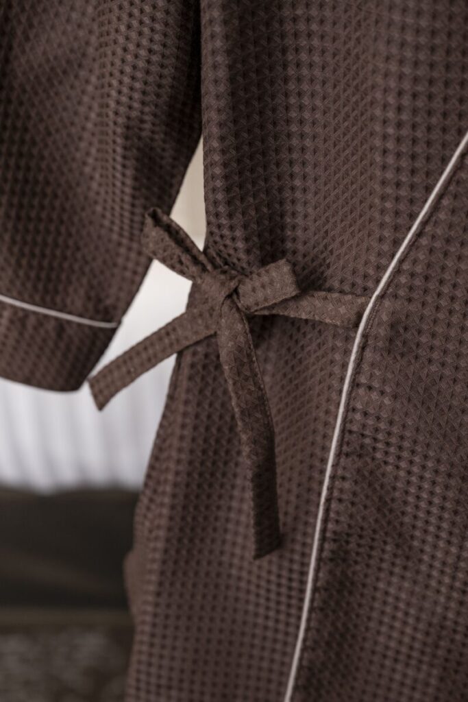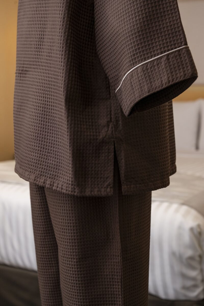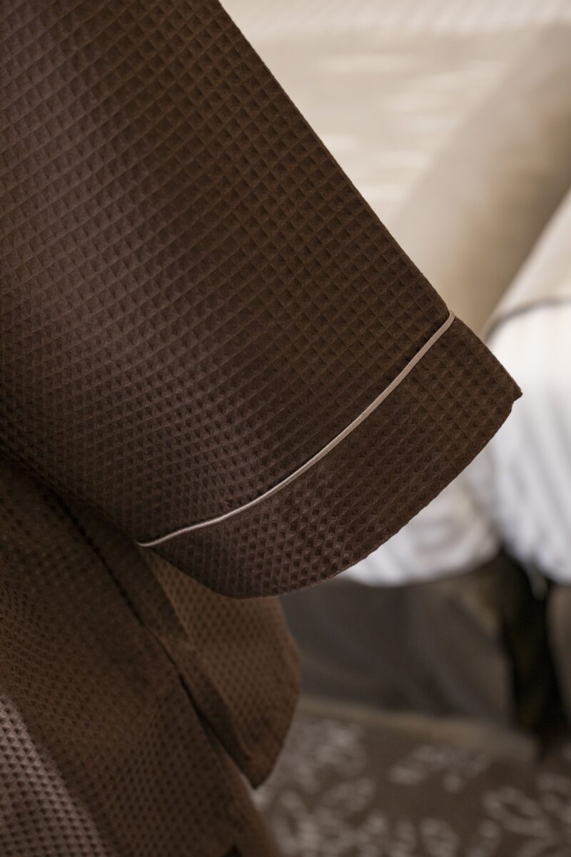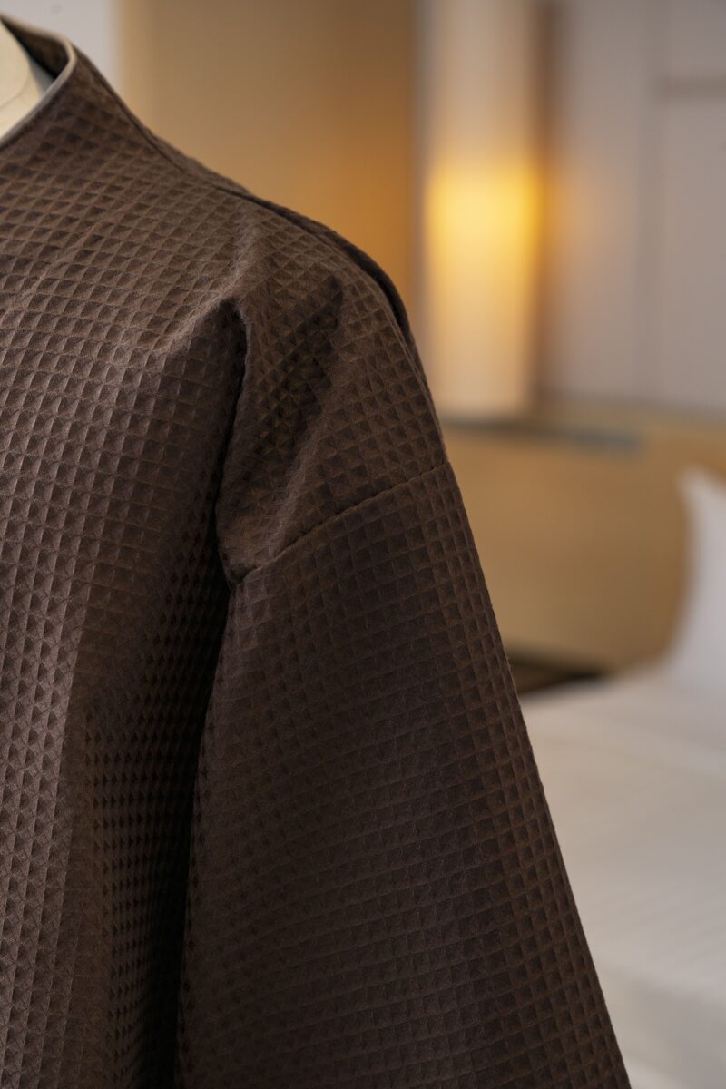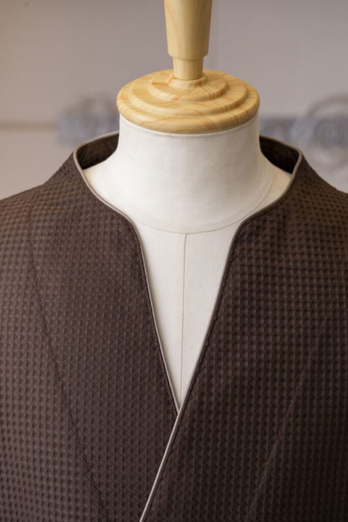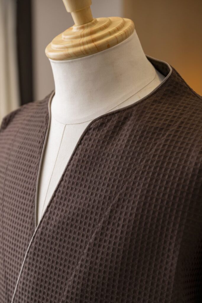 綿素材のボリューム感あるニットワッフル生地です。 リバーシブルタイプの生地で内側をワッフル地にすると肌との接触面が少ないので蒸れにくくさわやかな風合いになります。 四つ紐タイプ。バスローブとして使用することもできます。 …