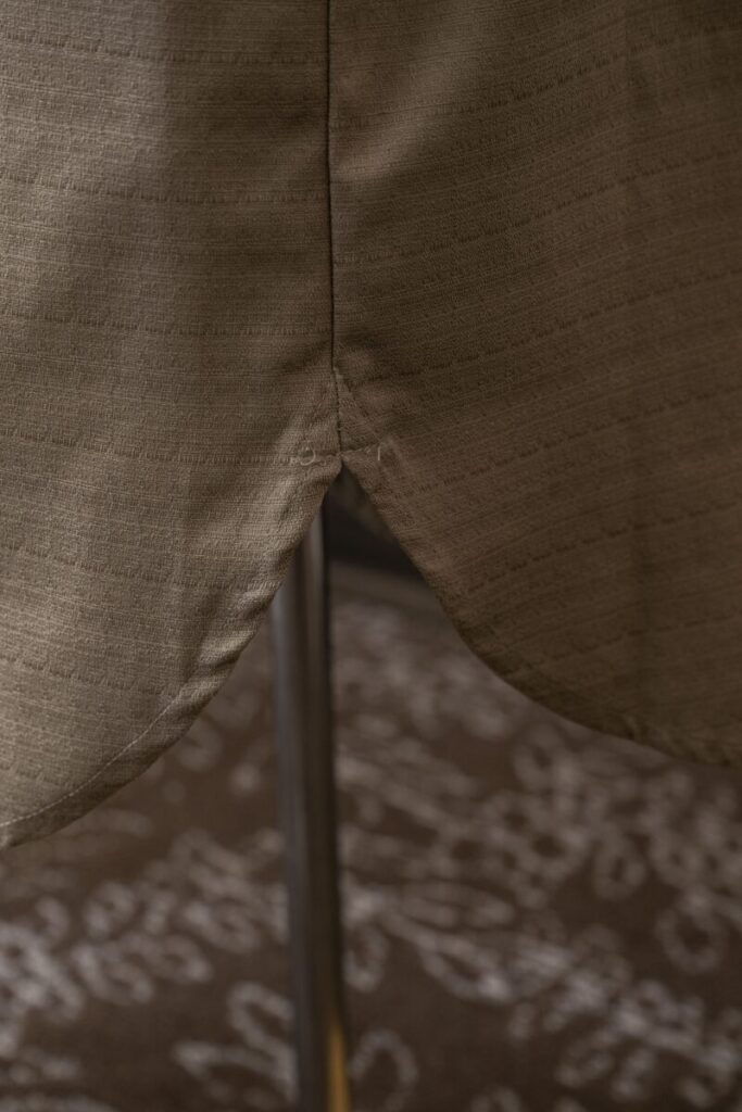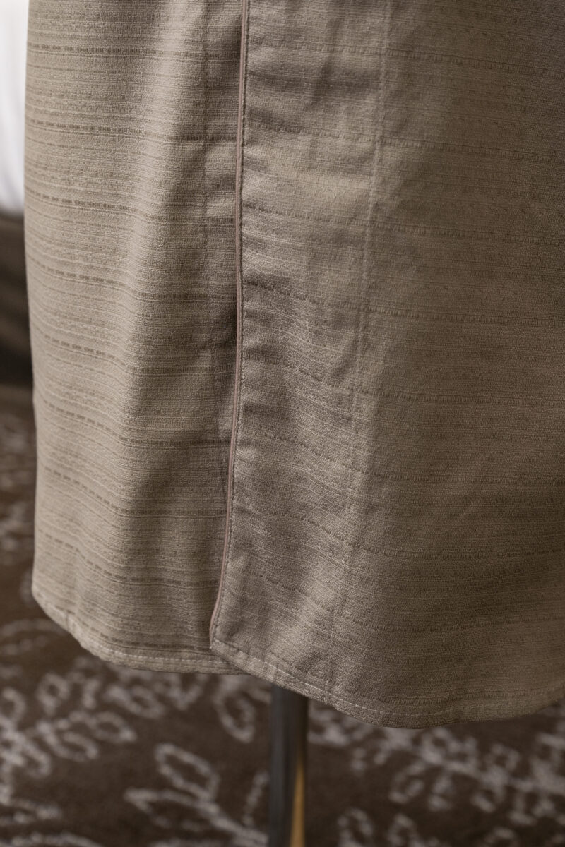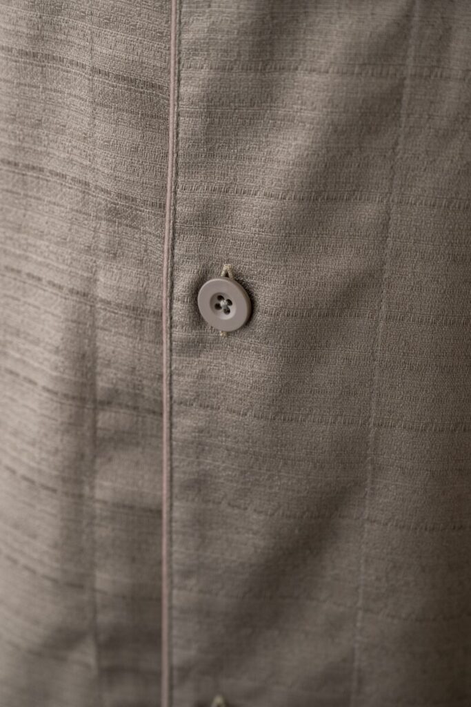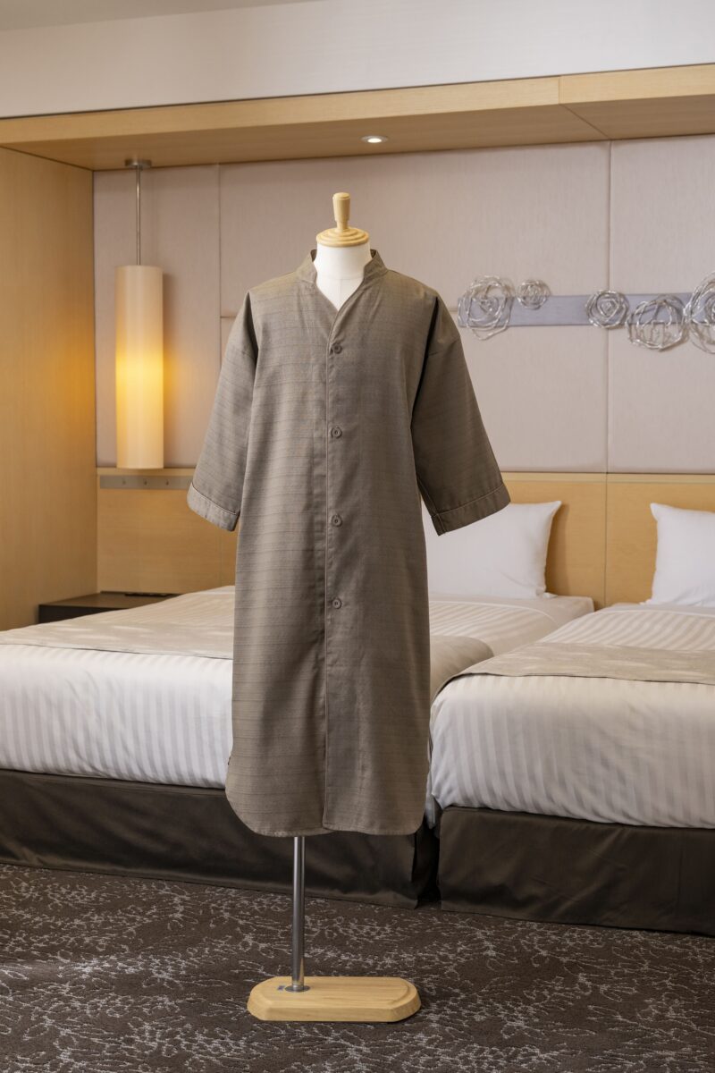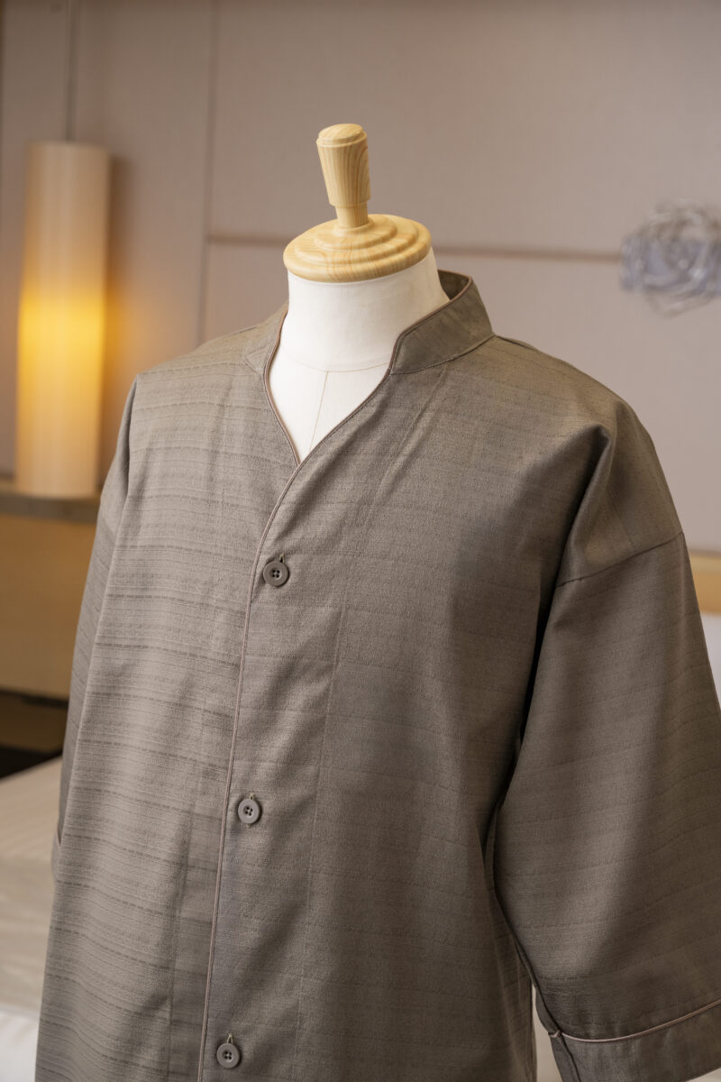 襟なしのボタン式の上下セット。 幅広い宿泊施設にマッチしやすいキャメル色のストライプ柄。 肉厚で柔らかな風合いのヘリンボーン生地を使用しています。 シワになりにくく丈夫で長持ちする生地です。 バイアスやボタンなどの色の変…