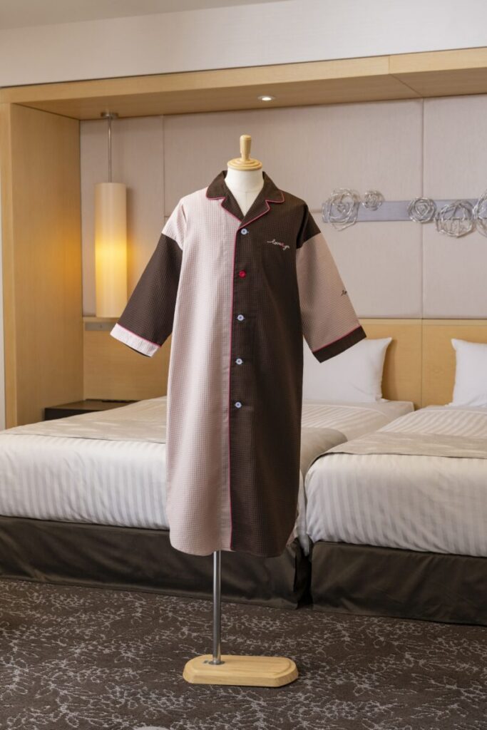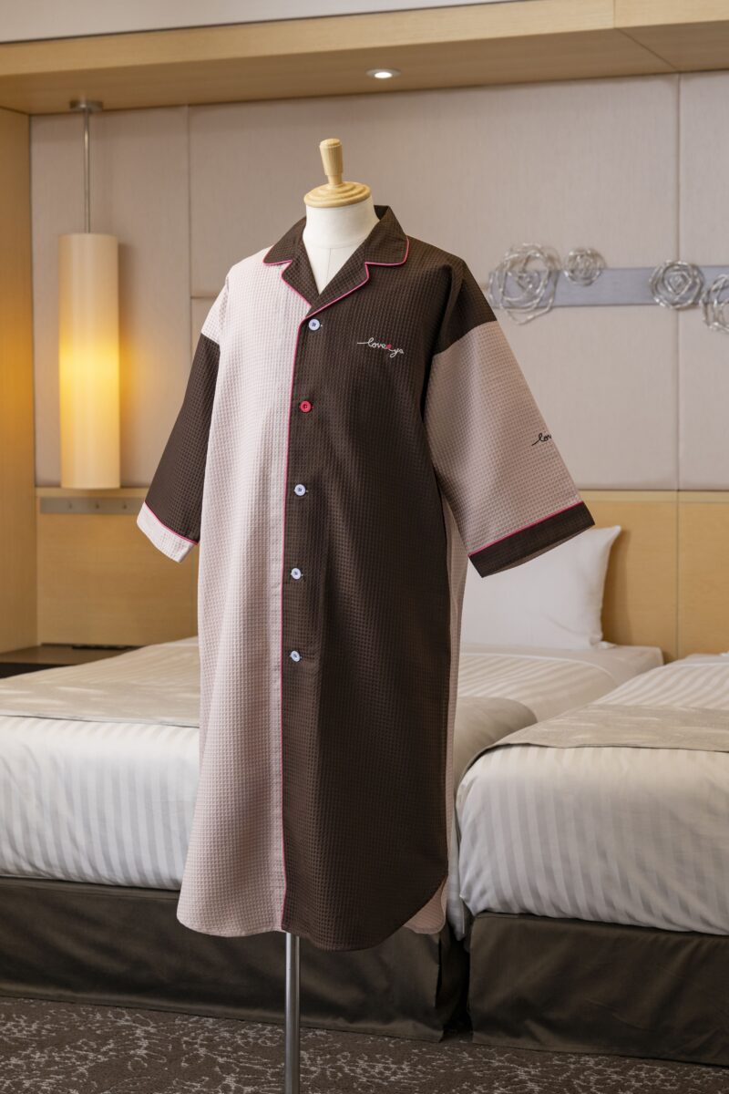 幅広い宿泊施設にマッチしやすいキャメル色のストライプ柄。 肉厚で柔らかな風合いのヘリンボーン生地を使用しています。 シワになりにくく丈夫で長持ちする生地です。 ガウン型のワンピース。バイアスやボタンなどの色の変更も可能で…