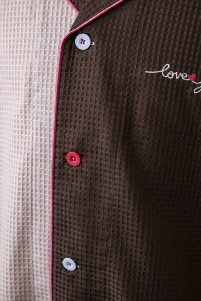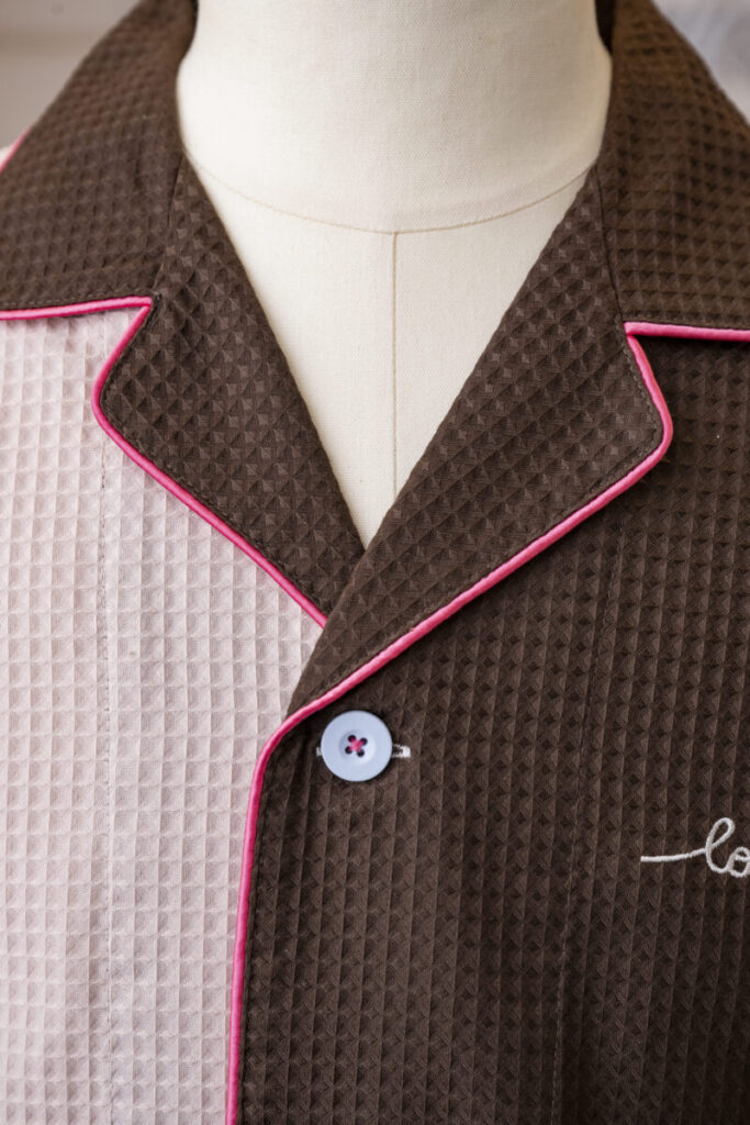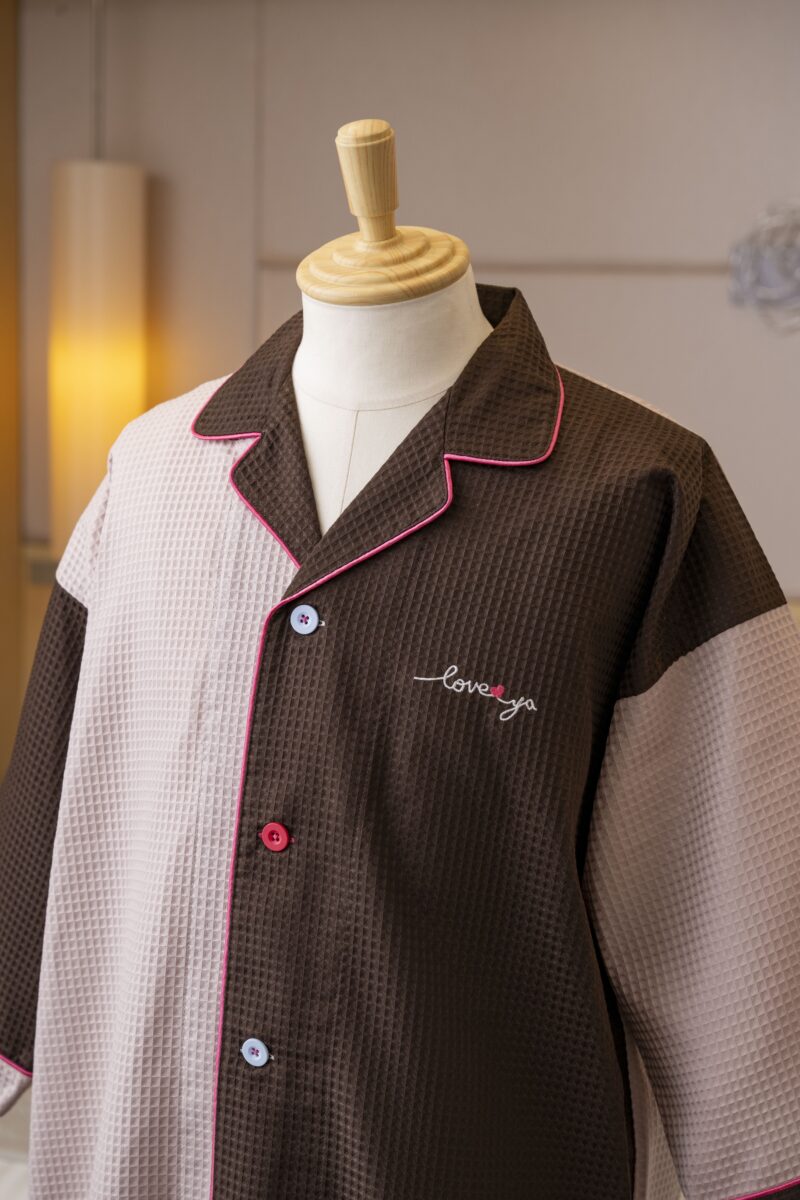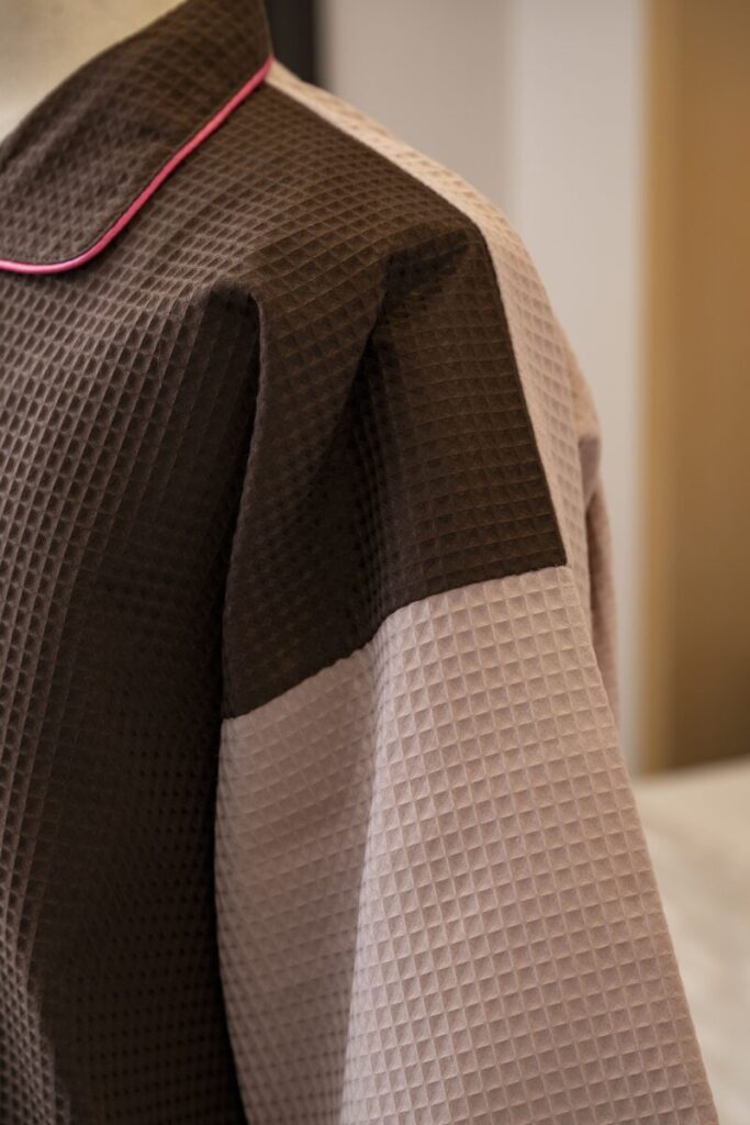 色違いのワッフル生地を組み合わせたクレイジーパターンのガウンです。