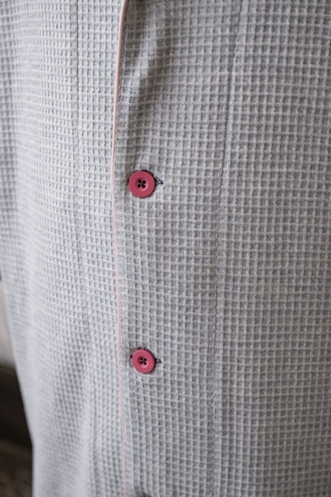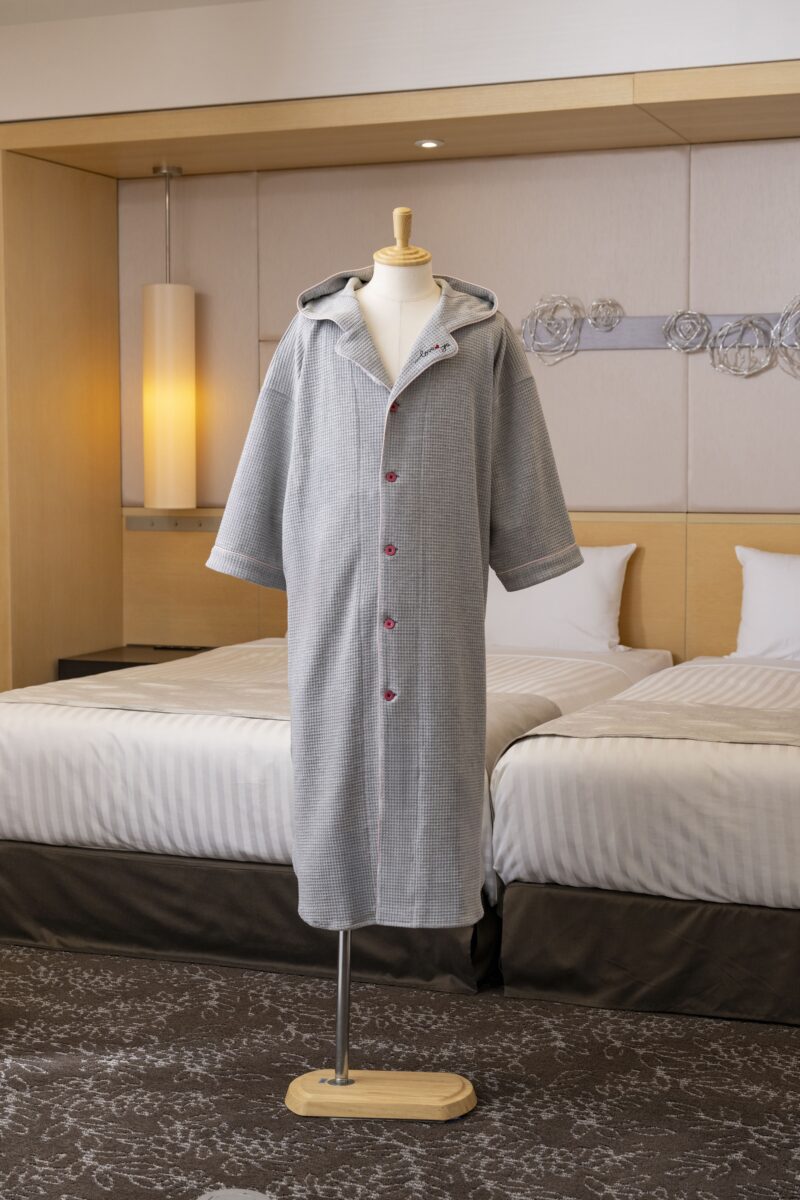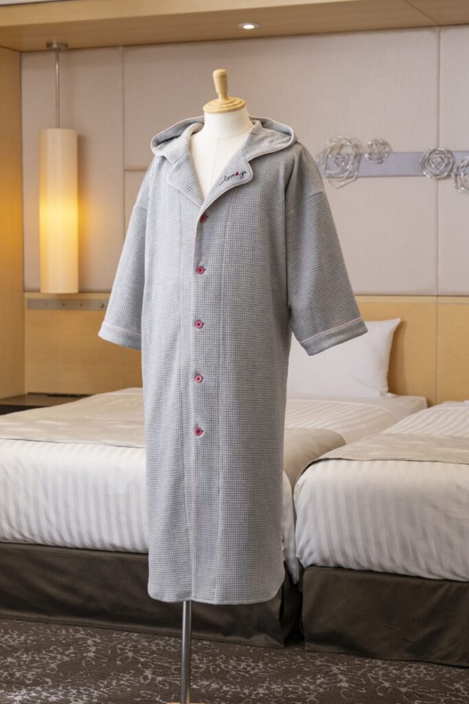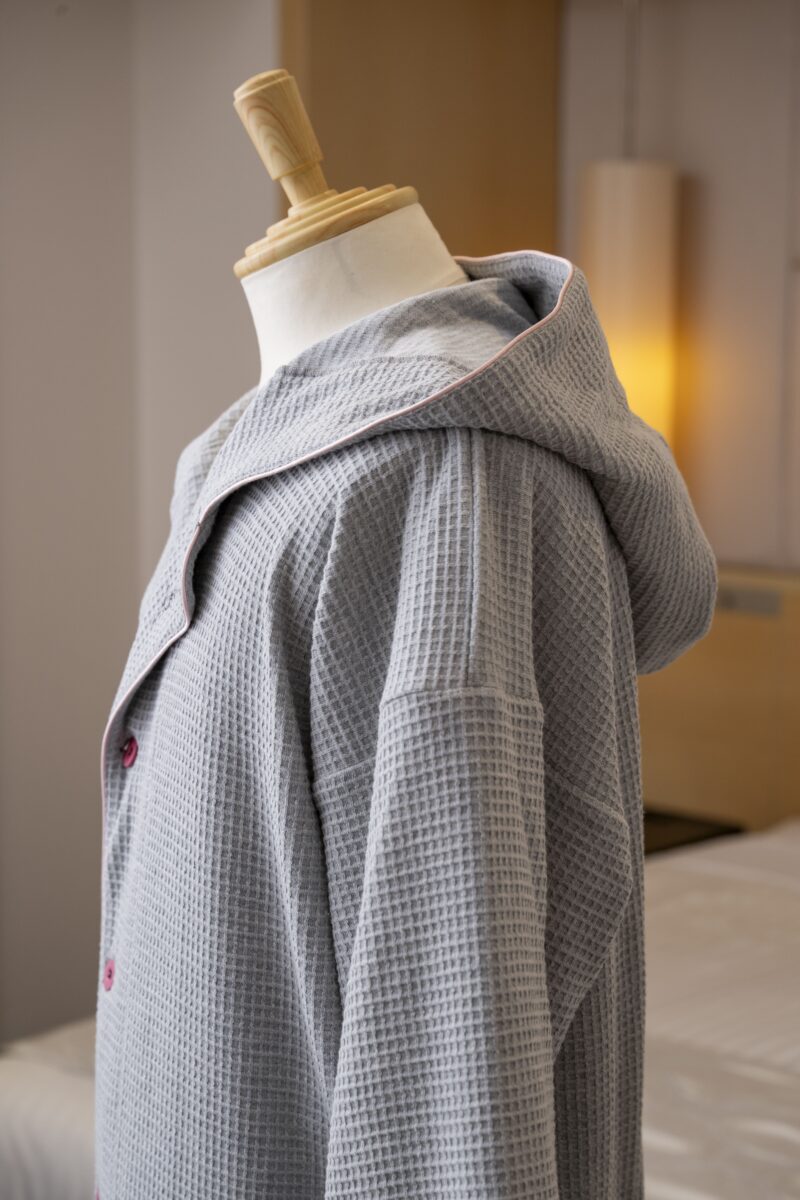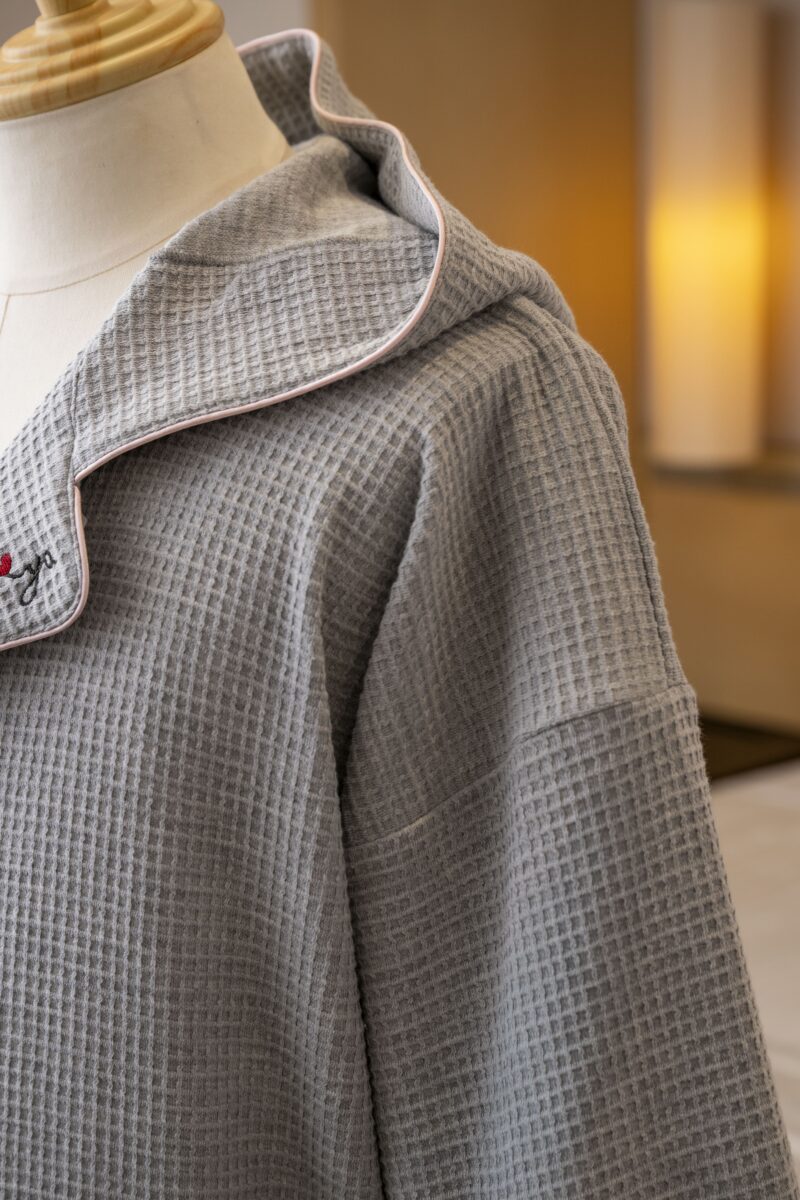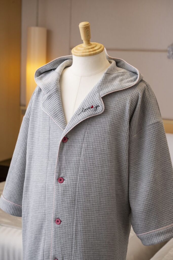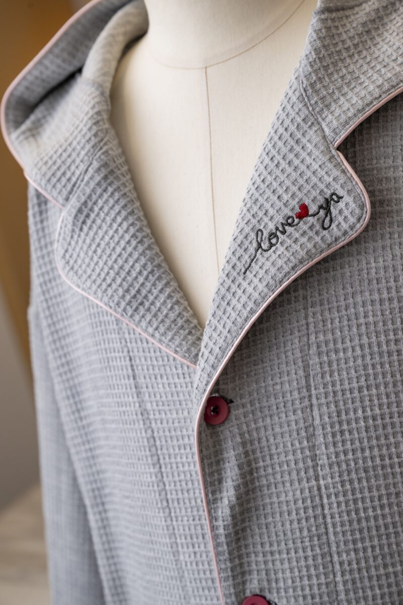 ボタン式のガウンですが、フードと襟に刺繍加工することで可愛らしさを演出しています。