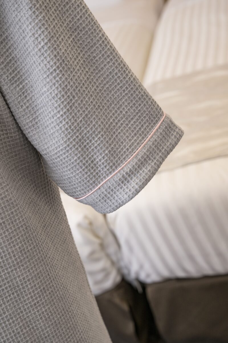綿素材のボリューム感あるニットワッフル生地です。 リバーシブルタイプの生地で内側をワッフル地にすると肌との接触面が少ないので蒸れにくくさわやかな風合いになります。 四つ紐タイプ。バスローブとして使用することもできます。 …